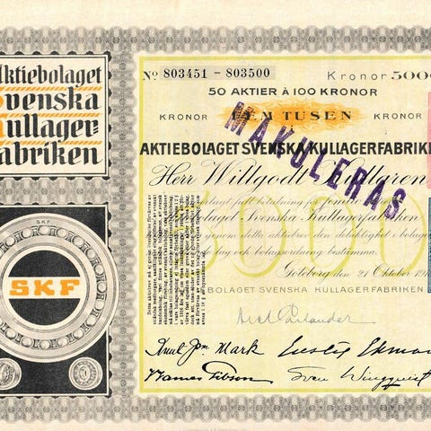 Aktiebrev (rosa) Svenska Kullagerfabriken (SKF) 1917. 1000:-