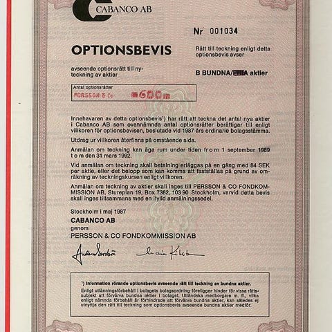 Optionsbevis gav rätt till 100 aktier. Storlek A 4:a. Mycket gott skick.