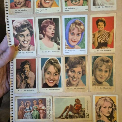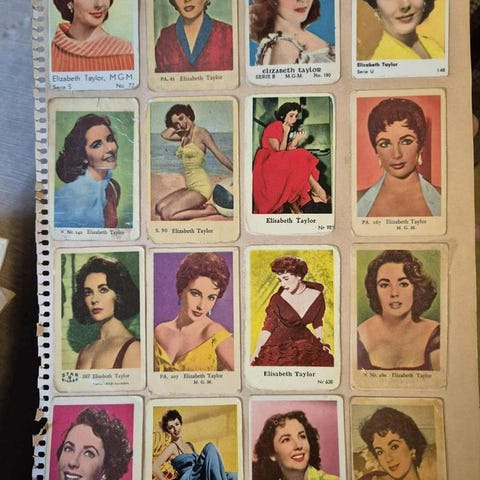 Samling av vintage samlarkort med bilder av Audrey Hepburn i olika poser och scener. Korten är av varierande storlek och visar porträtt och filmrelaterade motiv.