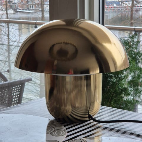 Silverfärgad lampfot 52 cm hög med lampskärm 70 cm.