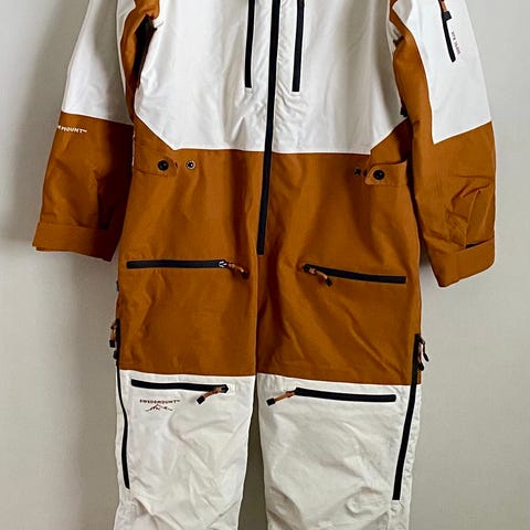 Snygg och praktisk vinteroverall i slimfit-modell använd en säsong. Rekommenderas för vinteraktiviteter och -promenader men ska man sitta still mycket ute som t ex åka snöskoter flera timmar så är den i tunnaste laget, upplevde jag. Den har fått sig några små skönhetsfläckar av grillkol, olja och annat svårt smuts efter dagar ute på vift samt ludd på kardborren från halsduk. Kommer tvätta vid leverans men dessa kan sitta kvar. Se bild 5 för ”defekter”.