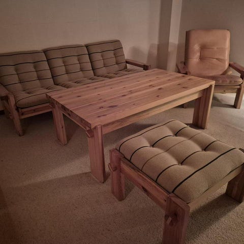 En fantastisk soffgrupp i massiv furu, designad av Yngve Ekström på 60/70-talet för Swedese. Här förenas robust hantverk med en lätt och svävande elegans – tack vare den böjda listen som lyfter sitsen och ger ett luftigt intryck.