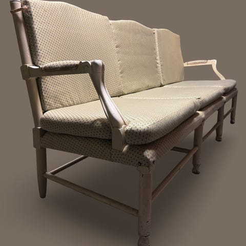 De mjukt formade armstöden och de generösa trädetaljerna ger värme och karaktär, medan originaldynorna i kraftigt canvastyg av lin bjuder på både stil och komfort.
