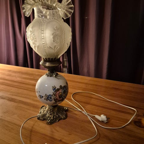 Gammal antik fin retro / vintage lampa i mässing och med porslinskupa. Fotogen liknande lampa men med el. Fint skick. Mått ca 46cm hög, kupa 88cm i dm. Lival made in Finland. Glödlampa ingår ej. Tror att det är en äldre kontakt (ojordad?) som har skurits.