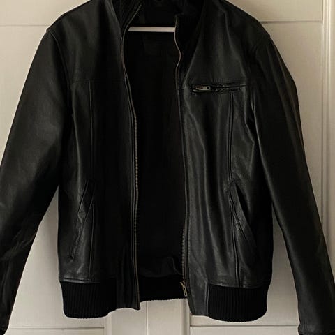 Kraftig stilig skinnjacka från Marc O Polo. Fint skick. Knappt använd. Brunt "buffalo" läder (se närbild). Knäpps med knappar. Två ytterfickor. Två innerfickor varav en med dragkedja.