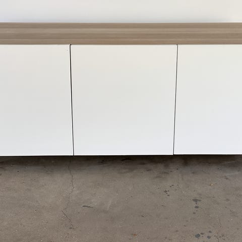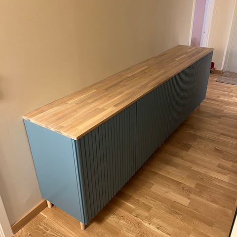 Säljer ett stilrent, väggmonterat sideboard byggt på två Ikea Metod-stommar, grå Veddinge-luckor och en ljus träskiva ovanpå.