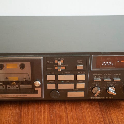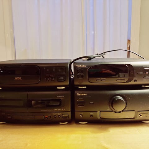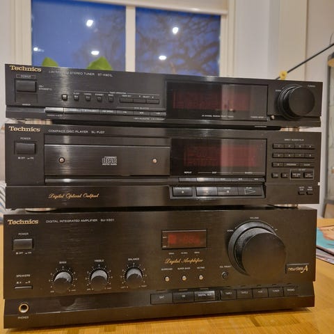 Förstärkaren krånglar-glapp i apparat väljaren i Komplett stereoanläggning bestående av en Technics SL-D2 skivspelare, en Technics SA-400K förstärkare, en Technics M10 kassettdäck, en Sony CD-spelare och ett par Sony högtalare. Allt är monterat i en tillhörande stereobänk.
