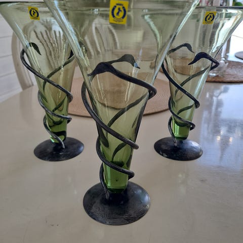 14 st trattglas även så kallade Birkabägare / Vikingaglas. Fyra stycken mellanstora dricksglas, fyra stycken större mjödglas och sex stycken snapsglas i mycket gott skick. Inga skador.