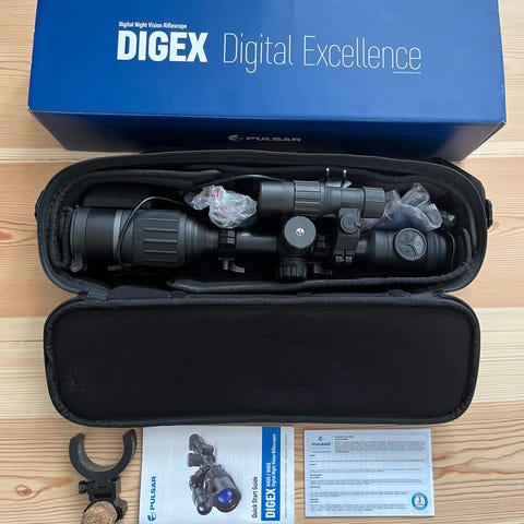 Siktet är som gott i nyskick, och kommer komplett med alla originaltillbehör – kartong, ir-lampa, laddkabel, fästen, solskydd och manualer.