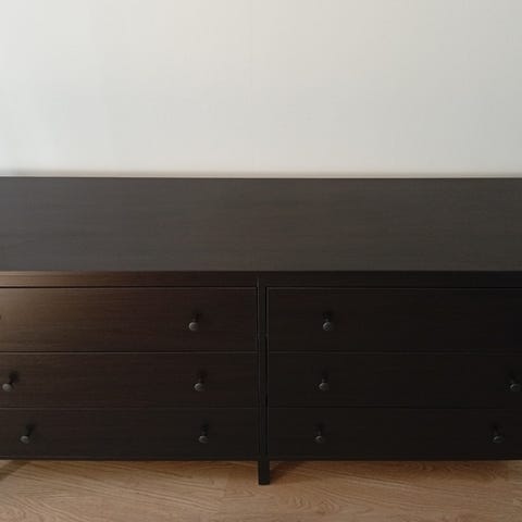 Har målat med kol / antracit / svart färg.2 översta Lådorna hade håll för nyckel som är saknad.😏 fyllt dem och bytt trasiga handtag mott dem gråa.