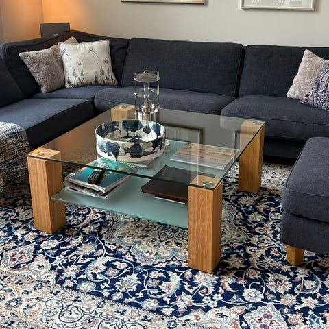 Säljer ett stilrent glasbord/soffbord i ek med inbyggd dekorbelysning som ger ett mycket fint ljusspel genom glaset.