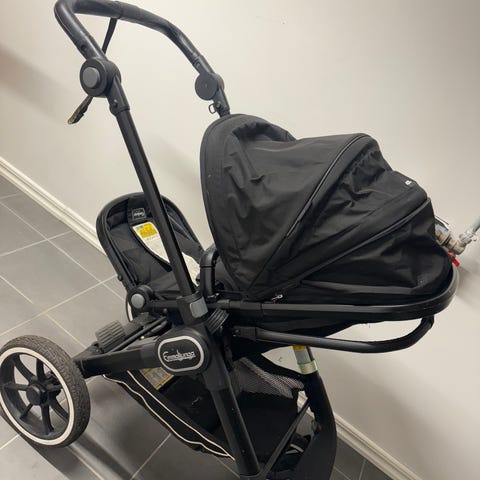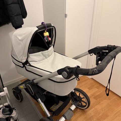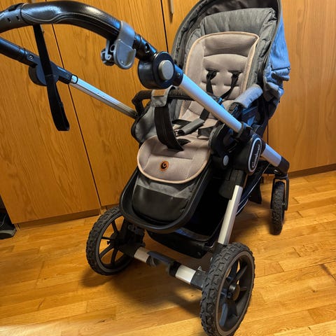 En av de tåligare barnvagnarna, perfekt för grusvägar, skogspromenader eller överallt där man vill ha en robust och mjukkörande vagn. Ligg- och sittdel i gott skick, solskärmen på sittdelen något solblekt annars inga defekter. Båda delarna är vändbara.
