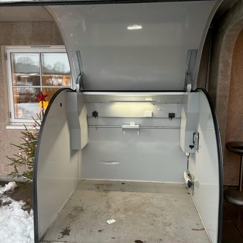 Så nu sitter det snabbspännen på varje sida som man fäster i 4 liters dunkar som är fyllda med grus som står på backen, så nu är det enkelt att komma in och kolla till fordonet under vintern.