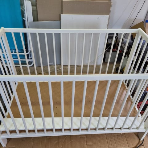 Hej. Säljer en GODNATT spjälsäng med JÄTTETRÖTT resårmadrass i mycket bra skick. Det enda som finns på den är att det släppt lite runt en skruv. (Se bifogad bild) Nypris är 2995 + 895. Säljes för 600kr