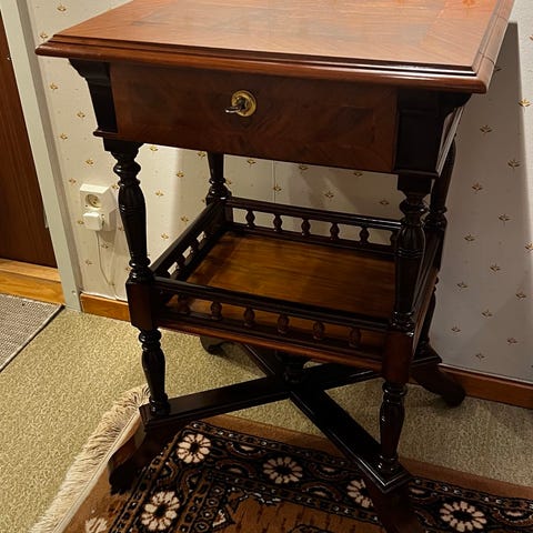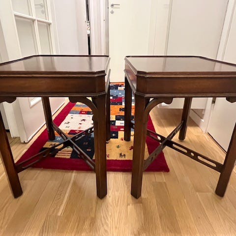2 st engelska sidbord i mahogny med detaljer i mässing, 1900-talets andra hälft i fint skick.