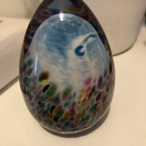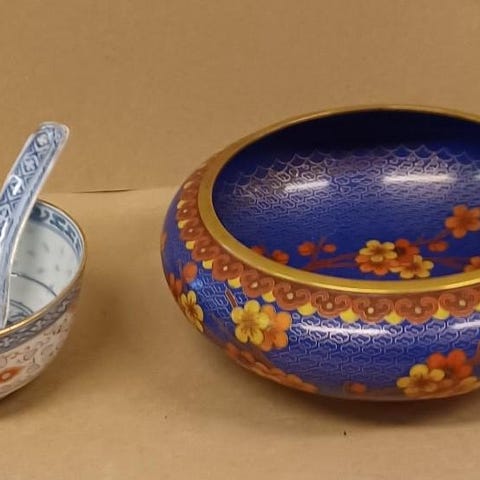 ett par handmålade kinesiska ägg, troligen från 1970-talet, som visas i en specialbyggd låda av trä och glas.