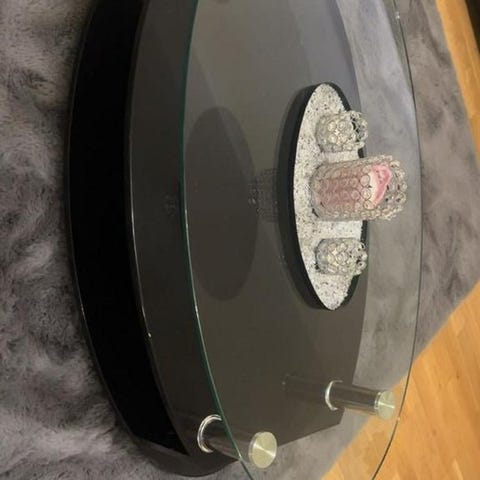 Ovanligt soffbord där skivorna "rullas ut". Max storlek är 134 cm och som minst 80 cm i diameter. Höjd 43. Inga skador på stativet, ringarna, inte på bottenplattan men mindre repor i glaset. Stora skivan hänger lite. För avhämtning dvs skickas inte