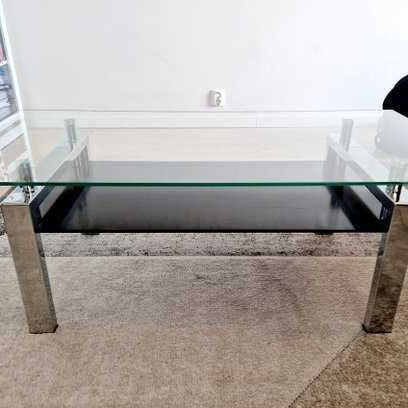 Ovanligt soffbord där skivorna "rullas ut". Max storlek är 134 cm Ovanligt som minst 80 cm i diameter. Höjd 43. Inga skador på stativet, ringarna, inte på bottenplattan men mindre repor i glaset. Stora skivan hänger lite. För avhämtning dvs skickas inte