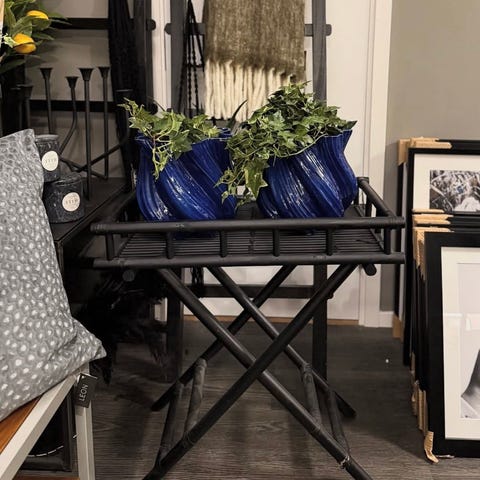 Serveringsvagn i trä med svart finish och hjul för enkel förflyttning. Vagnen har två hyllplan och handtag på sidorna. Passar för förvaring och transport av olika föremål i hemmet eller trädgården.