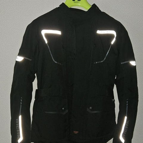 Motorcykeljacka: Textiljacka med avtagbar huva. Den har en vattenavvisande behandling som ger utmärkt prestanda under regniga dagar.