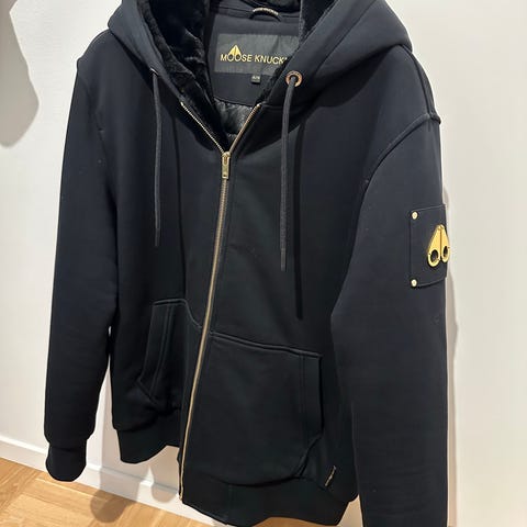 Riktigt snygg och stilren hoodie från Moose Knukles med guld detaljer och snygg guld logga på vänster arm. Använd väldigt få gånger, så sparsamt använd