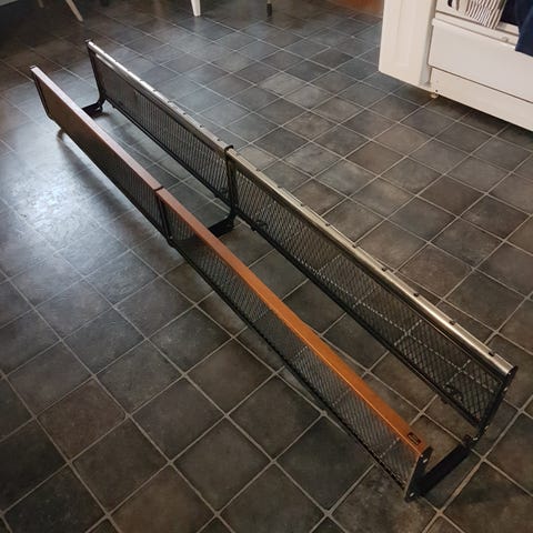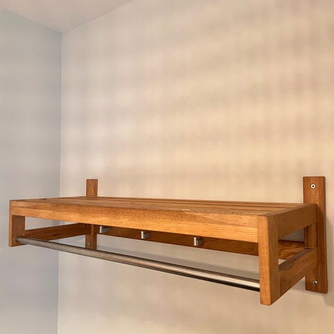 Fin hatthylla från Envex. Ek med vita perforerade hyllplan. Två krokar undertill och stång för galgar etc.