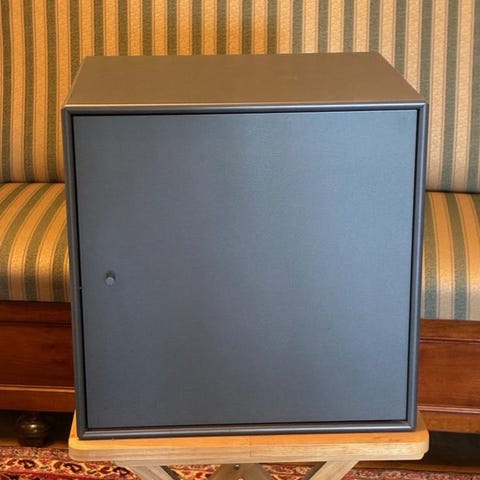 Kan ställs på golvet eller väggmonteras med väggskenor (original väggskenor medföljer).