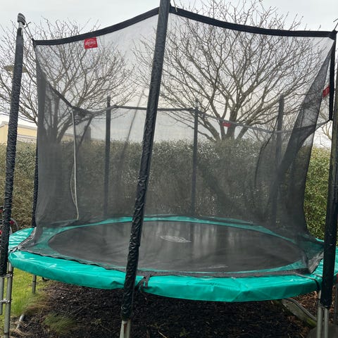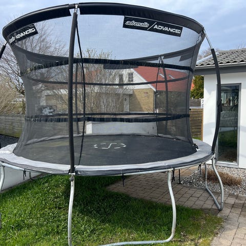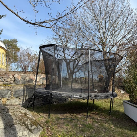 Väldigt robust oval studsmatta från svenska North. Välanvänd i behov av lite kärlek. Fungerar, men skulle behöva ett nytt kantskydd och en till stolpe. Skyddsnätet är nytt sen en säsong.