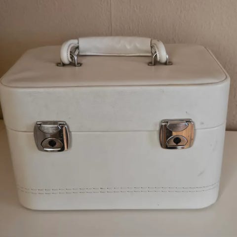 Fin vintage retro resväska sminkväska som är låsbar. Nyckel medföljer. Spegeln behöver bytas då den är gammal och blivit "dimmig"