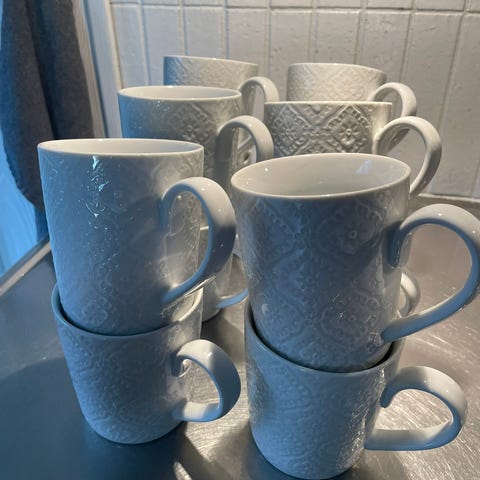 4st originella muggar i vitt porslin med ljusblått öra. Muggarna är högre i bakkant, en ovanlig men häftig design, syns bäst på bild 2.