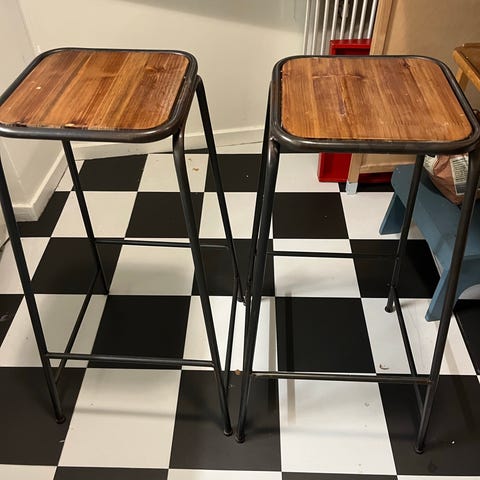 Två stilrena barstolar i rostfritt stål. Sparsamt använda i väldigt fint skick. 76 cm i höjd inklusive sitsen.