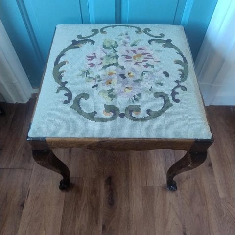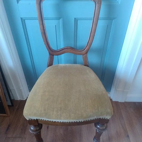 Vacker gammal stol med omklädd dyna.
