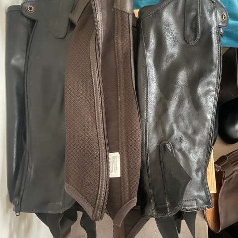 Säljer ett jättestort paket med ridutrustning då vår dotter har slutat rida, och använder inte sakerna längre. Se bilder för detaljer; men det mesta ingår som man behöver för att klara sig i stallet. Hjälm, väst, skor, hästvårdssaker etc. Olika storlekar men från 146 till 160 ca. Ridbyxor Maya de Lores m.fl., jacka och tröjor. Säljs som stort paket, fler bilder kan skickas då jag inte fått med alla saker o kläder på bilderna!
