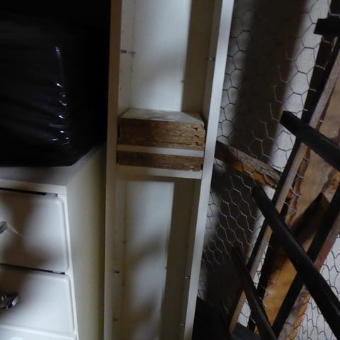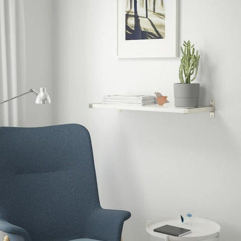Vägghylla IKEA BOAXEL med tre hyllplan i ekfolie, vit stomme. Kan byggas ut på höjden och bredden (hyllan finns fortfarande i IKEAs sortiment).