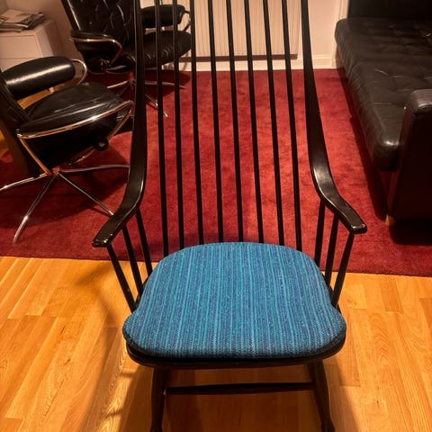 Äldre gungstol med patina. Trä. Fin som den är men gillar man en ”nyare look” så kan man så klart slipa upp den och måla den. Säljes i befintligt skick.