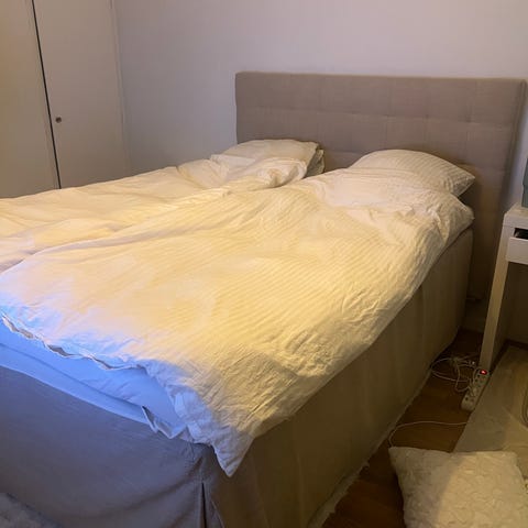1 år gammal Komplett Dubbelsäng med Förvaring + 2 Byråer . använt ett par gånger till våra gäster. 160*200. Jag har möjlighet att säljer delvis . OBS bara sängen köpte vi från IKEA för 5990 kr