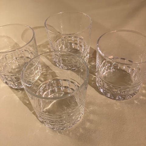 Flaska med kork, glas och snapsglas från Ulven glashytta Uppsala