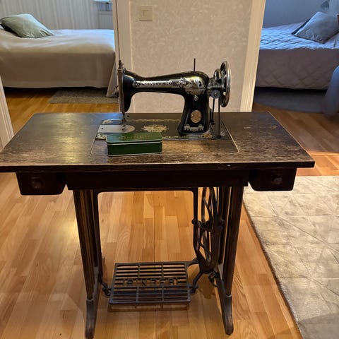 En äldre symaskin av märket singer. Remmen har gått av annars är den i såpass skick att man kan använda den! Bordsskivan har lite skador i trät som syns på bild. I ena lådan i bordet finns en ask full med olika tillbehör till maskinen. Nål sitter på plats.