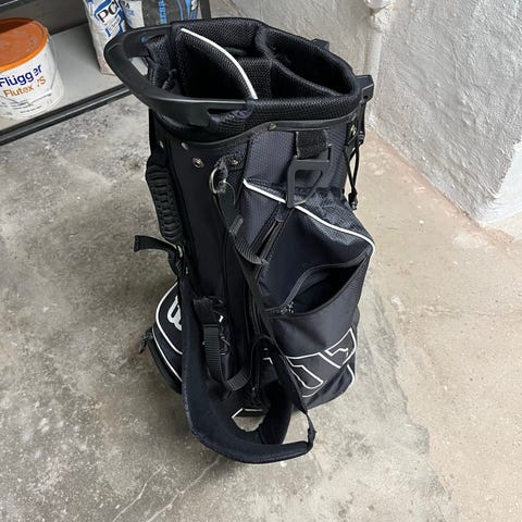 Wilson Staff Carry golfbag i svart och rött. Bagen är designad för att bäras och har flera fack för förvaring av golfklubbor och tillbehör.