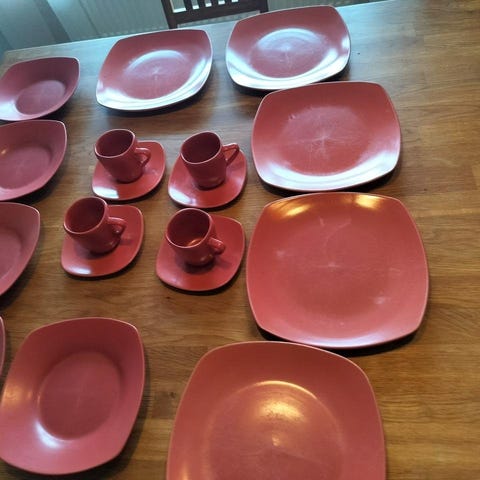 Det är en fin kaffekanna, sockerskål, gräddkanna, 9 st koppar, 11 fat samt 11 assietter. En kopp har en liten nagg. Fint porslin o god att dricka ur.