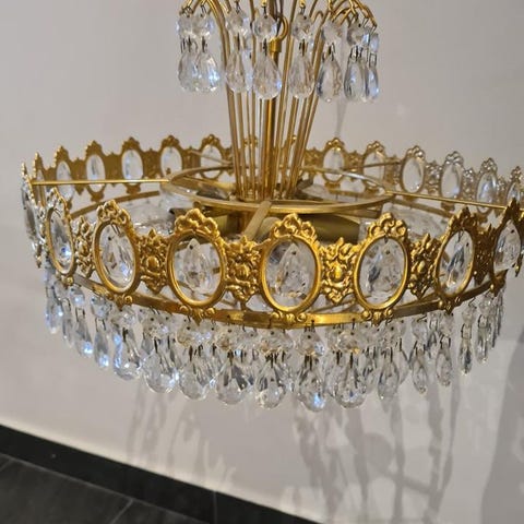 Klassisk kristallkrona med 12 ljusarmar – elegant och stämningsfull Säljer en vacker kristallkrona med 12 ljusarmar och dekorativa prismor i glas. Lampan ger ett lyxigt och klassiskt intryck och passar perfekt i vardagsrum, matsal eller hall med lite höjd i taket.
