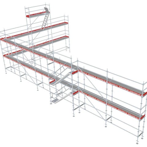 Begagnad modulställning i stål. Ställningen består av fyra sektioner på längden, dvs 12,28 meter lång. Den har två våningar som är ca 2,2 samt 4,2 meter. Den har två extra sektioner i mitten som är 6,2 meter. Djupet på ställningen är vanligtvis 0,73 meter, går även att få 1,09 meter eller mer. Ska kompletteras med fotlister och uppgångar för att användas på byggarbetsplats.