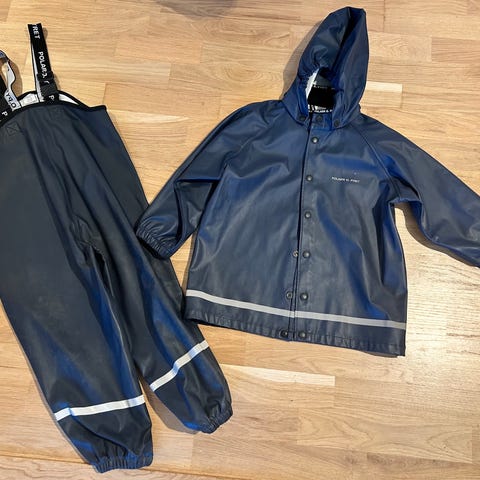 Regnjacka och regnbyxor med hängslen från Polaren O. Pyret. 110/116 (4-6 år)