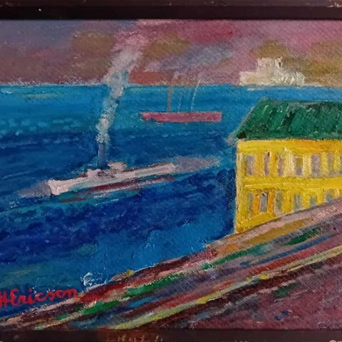 Oljemålning på duk med kraftig träram tillverkad av lokalt snickeri.
