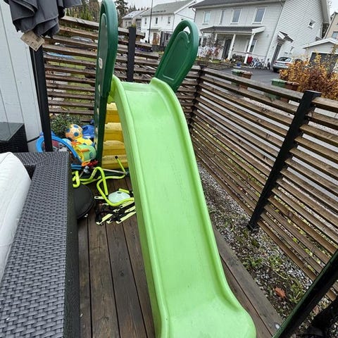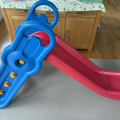Lite sprucken längst upp på kanten på rutschkanan på båda sidor, annars i bra skick där man sitter och åker.