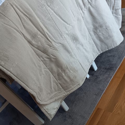 260x260 cm. Överkastet är vändbart. Likadant på fram och baksida. Yttertyg 55% polyester 45% polyamid. Fyllning 100 % polyester. Överkastet är brunt.