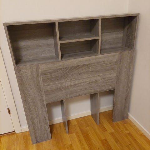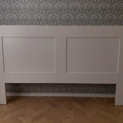 Hemmabyggd sänggavel med inbyggd bakgrundsbelysning och läslampor som är separatkopplade och dimbara.