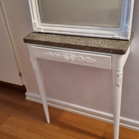 Konsolbord med stenskiva sarg med pastellage och rosor, kopplad benställning, bredd 97cm djup 37cm höjd 74cm, smärre slitage, men ändå vacker. Hämtas!