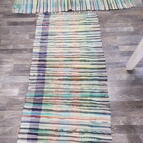 Vacker hemvävd trasmatta i klara fina färger i röt blått och vitt. Mått ca 5,22 m lång och 0,70 m bred. En jättefin och rejäl tjock trasmatta som väger ca 7,5 kg. Fint men i använt bruksskick. Lite små trådar som synes i mattan här och där, se närbild. Ej tvättad. Går bra att hämta eller kan skickas. Ska den skickas skickas den spårbart med DHL frakt kostar 130 kr