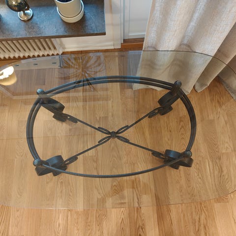 Soffbord i valnötsfaner med ram i rostfritt stål. Underliggande glasskiva. Mått: 91x91 cm. Höjd: 45 cm